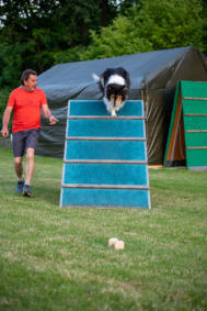 Bei der Übung "Sitz aus der Bewegung", muss sich der Hund hinsetzen und der Hundeführer entfernt sich vom sitzenden Hund in