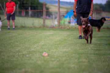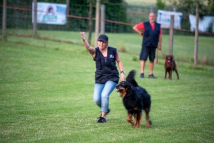 wobei sich hier der Hundeführer in einer festgelegten Entfernung mit dem Rücken zum Hund stellt.